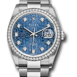 36mm Oystersteel case, screw-down steel back, screw-down crown with twinlock double waterproofness system, diamond bezel, scratch-resistant sapphire crystal with cyclops lens over the date, blue Jubilee dial, diamond hour markers, Rolex calibre 3235 perpetual self-winding movement with center hour, minute and seconds hands, instantaneous date at 3 o'clock with rapid setting, and stop-seconds for precise time setting, approximately 70 hours of power reserve, Oyster bracelet with flat three-piece links, folding Oysterclasp buckle with Easylink 5mm comfort extension link. Waterproof to 100 meters. Baselworld 2019 release.