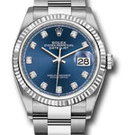36mm Oystersteel case, screw-down steel back, screw-down crown with twinlock double waterproofness system, fluted bezel, scratch-resistant sapphire crystal with cyclops lens over the date, blue dial, diamond hour markers, Rolex calibre 3235 perpetual self-winding movement with center hour, minute and seconds hands, instantaneous date at 3 o'clock with rapid setting, and stop-seconds for precise time setting, approximately 70 hours of power reserve, Oyster bracelet with flat three-piece links, folding Oysterclasp buckle with Easylink 5mm comfort extension link. Waterproof to 100 meters. Baselworld 2019 release.