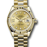 28mm 18K yellow gold oyster case, screw-down crown with twinlock double waterproofness system, fluted bezel, scratch-resistant sapphire crystal with cyclops lens over the date and double anti-reflective coating, champagne dial, 9 diamonds set in star shaped hour marker settings and 8 diamond set in Roman numeral IX, Rolex calibre 2236 automatic movement with center hour, minute and seconds hands, instantaneous date with rapid setting, and stop-seconds for precise time setting, 18K yellow gold President bracelet with semi-circular three-piece links, concealed folding Crownclasp buckle. Waterproof to 100 meters.