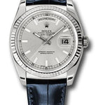 36mm 18K white gold case, screw-down crown, fluted bezel, silver dial, index hour markers, Rolex calibre 3155 automatic movement with instantaneous date and day windows, approximately 48 hours of power reserve, blue leather strap, folding buckle. Waterproof to 100 meters.
