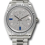 40mm 18K white gold case, screw-down back with Rolex fluting, screw-down crown with twinlock double waterproofness system, fluted bezel, scratch-resistant double anti-reflective sapphire crystal with cyclops lens over the date, diamond paved dial, 8 baguette-cut diamond hour markers and 2 baguette-cut sapphires, Rolex calibre 3255 automatic movement with centre hour, minute and seconds hands, instantaneous day and date in apertures, unrestricted rapid-setting, and stop-seconds for precise time setting, approximately 70 hours of power reserve, President bracelet with three-piece solid links comprised of a polished center link, satin-finished outer links, and ceramic inserts, concealed folding Crownclasp buckle. Waterproof to 100 meters.