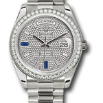 40mm 18K white gold case, screw-down back with Rolex fluting, screw-down crown with twinlock double waterproofness system, 18K white gold bezel set with 48 diamonds, scratch-resistant double anti-reflective sapphire crystal with cyclops lens over the date, diamond paved dial, 8 baguette-cut diamond hour markers and 2 baguette-cut sapphires, Rolex calibre 3255 automatic movement with centre hour, minute and seconds hands, instantaneous day and date in apertures, unrestricted rapid-setting, and stop-seconds for precise time setting, approximately 70 hours of power reserve, President bracelet with three-piece solid links comprised of a polished center link, satin-finished outer links, and ceramic inserts, concealed folding Crownclasp buckle. Waterproof to 100 meters.