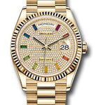 36mm 18K yellow gold case, screw-down back, screw-down crown with twinlock double waterproofness system, fluted bezel, scratch-resistant sapphire crystal with cyclops lens over the date, diamond-paved dial, rainbow-colored sapphire hour markers, Rolex calibre 3255 perpetual self-winding movement with centre hour, minute and seconds hands, instantaneous day and date in apertures, unrestricted rapid-setting, and stop-seconds for precise time setting, approximately 70 hours of power reserve, 18K yellow gold President bracelet with semi-circular three-piece links, concealed folding Crownclasp buckle. Waterproof to 100 meters. Baselworld 2019 release.