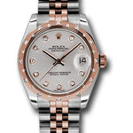 31mm stainless steel case, pink gold gold screw-down crown, 18K pink gold domed bezel set with 24 diamonds, scratch-resistant sapphire crystal with cyclops lens over the date, silver dial, diamond hour markers, Rolex calibre 2235 automatic movement, stainless steel and pink gold Jubilee bracelet with five-piece links, concealed folding Crownclasp buckle. Waterproof to 100 meters.