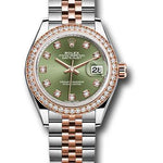28mm Everose Rolesor case comprised of a 904L steel monobloc middle case, screw-down steel back, 18K Everose gold screw-down crown with twinlock double waterproofness system, 18K Everose gold diamond bezel, scratch-resistant sapphire crystal with cyclops lens over the date and double anti-reflective coating, olive green dial, diamond hour markers, Rolex calibre 2236 automatic movement with center hour, minute and seconds hands, instantaneous date with rapid setting, and stop-seconds for precise time setting, Everose Rolesor Jubilee bracelet comprised of a combination of 904L steel and 18K Everose gold in five-piece links, concealed folding Crownclasp buckle. Waterproof to 100 meters.