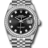 36mm Oystersteel case, screw-down steel back, screw-down crown with twinlock double waterproofness system, diamond bezel, scratch-resistant sapphire crystal with cyclops lens over the date, black dial, diamond hour markers, Rolex calibre 3235 perpetual self-winding movement with center hour, minute and seconds hands, instantaneous date at 3 o'clock with rapid setting, and stop-seconds for precise time setting, approximately 70 hours of power reserve, Jubilee bracelet with five-piece links, folding Oysterclasp buckle with Easylink 5mm comfort extension link. Waterproof to 100 meters. Baselworld 2019 release.