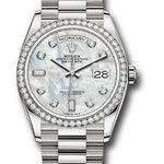 36mm 18K white gold case, screw-down back, screw-down crown with twinlock double waterproofness system, bezel set with 52 diamonds, scratch-resistant sapphire crystal with cyclops lens over the date, mother-of-pearl dial, diamond hour markers, Rolex calibre 3255 perpetual self-winding movement with centre hour, minute and seconds hands, instantaneous day and date in apertures, unrestricted rapid-setting, and stop-seconds for precise time setting, approximately 70 hours of power reserve, 18K white gold President bracelet with semi-circular three-piece links, concealed folding Crownclasp buckle. Waterproof to 100 meters. Baselworld 2019 release.