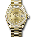 28mm 18K yellow gold oyster case, screw-down crown with twinlock double waterproofness system, bezel set with 44 diamonds, scratch-resistant sapphire crystal with cyclops lens over the date and double anti-reflective coating, champagne dial, 10 diamond hour markers, Rolex calibre 2236 automatic movement with center hour, minute and seconds hands, instantaneous date with rapid setting, and stop-seconds for precise time setting, 18K yellow gold President bracelet with semi-circular three-piece links, concealed folding Crownclasp buckle. Waterproof to 100 meters.