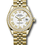 28mm 18K yellow gold oyster case, screw-down crown with twinlock double waterproofness system, bezel set with 44 diamonds, scratch-resistant sapphire crystal with cyclops lens over the date and double anti-reflective coating, white dial, Roman numerals, Rolex calibre 2236 automatic movement with center hour, minute and seconds hands, instantaneous date with rapid setting, and stop-seconds for precise time setting, 18K yellow gold Jubilee bracelet with five-piece links, concealed folding Crownclasp buckle. Waterproof to 100 meters.
