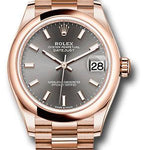 31mm 18K Everose gold case, screw-down crown with twinlock double waterproofness system, domed bezel, scratch-resistant sapphire crystal with cyclops lens over the date, dark rhodium dial, index hour markers, Rolex calibre 2236 automatic movement with center hour, minute and seconds hands, instantaneous date with rapid setting, and stop-seconds for precise time setting, approximately 55 hours of power reserve, 18K Everose gold President bracelet with semi-circular three-piece links, concealed folding Crownclasp buckle. Waterproof to 100 meters.