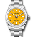 31mm Oystersteel case, screw-down crown with twinlock double waterproofness system, domed bezel, scratch-resistant sapphire crystal, yellow dial, index hour markers, Rolex calibre 2232 automatic movement with center hour, minute and seconds hands, and stop-seconds for precise time setting, approximately 55 hours of power reserve, Oyster bracelet with flat three-piece links, folding Oysterclasp buckle with Easylink 5mm comfort extension link. Waterproof to 100 meters.