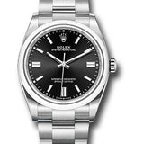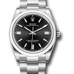 36mm Oystersteel case, screw-down crown with twinlock double waterproofness system, domed bezel, scratch-resistant sapphire crystal, bright black dial, index hour markers, Rolex calibre 3230 automatic movement with center hour, minute and seconds hands, and stop-seconds for precise time setting, approximately 70 hours of power reserve, Oyster bracelet with flat three-piece links, folding Oysterclasp buckle with Easylink 5mm comfort extension link. Waterproof to 100 meters.
