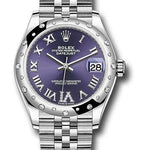 31mm white Rolesor case comprised of Oystersteel and 18K white gold, screw-down back, screw-down crown with twinlock double waterproofness system, 18K white gold domed bezel set with 24 diamonds, scratch-resistant sapphire crystal with cyclops lens over the date, aubergine dial, Roman numerals with diamond set 6, Rolex calibre 2236 perpetual self-winding movement with date at 3 o'clock, approximately 55 hours of power reserve, Oystersteel Jubilee bracelet with five-piece links, concealed folding Crownclasp buckle. Waterproof to 100 meters.