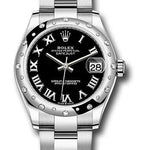 31mm white Rolesor case comprised of Oystersteel and 18K white gold, screw-down back, screw-down crown with twinlock double waterproofness system, 18K white gold domed bezel set with 24 diamonds, scratch-resistant sapphire crystal with cyclops lens over the date, black dial, Roman numerals, Rolex calibre 2236 perpetual self-winding movement with date at 3 o'clock, approximately 55 hours of power reserve, Oystersteel Oyster bracelet with flat three-piece links, concealed folding Oysterclasp buckle. Waterproof to 100 meters.