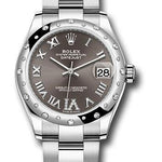 31mm white Rolesor case comprised of Oystersteel and 18K white gold, screw-down back, screw-down crown with twinlock double waterproofness system, 18K white gold domed bezel set with 24 diamonds, scratch-resistant sapphire crystal with cyclops lens over the date, dark grey dial, Roman numerals with diamond set 6, Rolex calibre 2236 perpetual self-winding movement with date at 3 o'clock, approximately 55 hours of power reserve, Oystersteel Oyster bracelet with flat three-piece links, concealed folding Oysterclasp buckle. Waterproof to 100 meters.