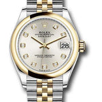 31mm yellow Rolesor case comprised of Oystersteel and 18K yellow gold, screw-down back, screw-down crown with twinlock double waterproofness system, 18K yellow gold domed bezel, scratch-resistant sapphire crystal with cyclops lens over the date, silver dial, diamond hour markers, Rolex calibre 2236 perpetual self-winding movement with date at 3 o'clock, approximately 55 hours of power reserve, yellow Rolesor Jubilee bracelet with semi-circular three-piece links, concealed folding Crownclasp buckle. Waterproof to 100 meters. Baselworld 2019 release.