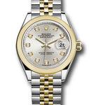 28mm yellow Rolesor case comprised of a 904L steel monobloc middle case, screw-down steel back, 18K yellow gold screw-down crown with twinlock double waterproofness system, 18K yellow gold domed bezel, scratch-resistant sapphire crystal with cyclops lens over the date and double anti-reflective coating, silver dial, diamond hour markers, Rolex calibre 2236 automatic movement with center hour, minute and seconds hands, instantaneous date with rapid setting, and stop-seconds for precise time setting, yellow gold Rolesor Jubilee bracelet comprised of a combination of 904L steel and 18K yellow gold in five-piece links, concealed folding Crownclasp buckle. Waterproof to 100 meters.