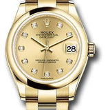 31mm 18K yellow gold case, screw-down crown with twinlock double waterproofness system, domed bezel, scratch-resistant sapphire crystal with cyclops lens over the date, champagne dial, 10 diamond hour markers, Rolex calibre 2236 automatic movement with center hour, minute and seconds hands, instantaneous date with rapid setting, and stop-seconds for precise time setting, approximately 55 hours of power reserve, 18K yellow gold Oyster bracelet with flat three-piece links, concealed folding Crownclasp buckle. Waterproof to 100 meters.