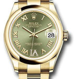 31mm 18K yellow gold case, screw-down crown with twinlock double waterproofness system, domed bezel, scratch-resistant sapphire crystal with cyclops lens over the date, olive green diamond Roman IV dial, Roman numerals with 11 diamonds set on VI, Rolex calibre 2236 automatic movement with center hour, minute and seconds hands, instantaneous date with rapid setting, and stop-seconds for precise time setting, approximately 55 hours of power reserve, 18K yellow gold Oyster bracelet with flat three-piece links, concealed folding Crownclasp buckle. Waterproof to 100 meters.