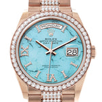 Indulge in the elegance and precision of the Rolex Day-Date 36 Turquoise Dial Diamond Bezel 18K Everose Gold Diamond President Watch, an embodiment of timeless luxury and sophistication.