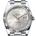 Presented with the prestigious Swiss Made label, the Rolex Day-Date 40 in Platinum, featuring a Silver Diamonds Dial with a Fluted Bezel and a Platinum President Bracelet, stands as an icon of impeccable craftsmanship and timeless refinement.