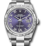 36mm Oystersteel case, screw-down steel back, screw-down crown with twinlock double waterproofness system, fluted bezel, scratch-resistant sapphire crystal with cyclops lens over the date, aubergine dial, Roman numerals with diamond set 6 and 9, Rolex calibre 3235 perpetual self-winding movement with center hour, minute and seconds hands, instantaneous date at 3 o'clock with rapid setting, and stop-seconds for precise time setting, approximately 70 hours of power reserve, Oyster bracelet with flat three-piece links, folding Oysterclasp buckle with Easylink 5mm comfort extension link. Waterproof to 100 meters. Baselworld 2019 release.