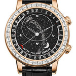 44 mm rose gold case, 11.33 mm thick, sapphire-crystal back, sapphire-crystal dial with Milky Way sky chart, caliber 240 LU CL C self-winding movement, approximately 38-48 hours of power reserve, shiny black alligator strap with rectangular scales, fold-over buckle. Water resistant to 30 m.