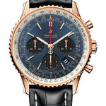 43.00 mm red gold case, 14.22 mm thick, sapphire crystal back, non screw-locked crown with two gaskets, bidirectional bezel with slide rule, cambered sapphire crystal with glareproof treatment on both sides, blue dial, Breitling 01 self-winding movement with date in dial aperture and chronograph function, approximately 70 hours of power reserve, black croco strap, tang buckle. Water resistant to 3 bars.