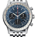 43.00 mm steel case, 14.22 mm thick, sapphire crystal back, non screw-locked crown with two gaskets, bidirectional bezel with slide rule, cambered sapphire crystal with glareproof treatment on both sides, mercury silver dial, Breitling 01 self-winding movement with date in dial aperture and chronograph function, approximately 70 hours of power reserve, steel Pilot bracelet. Water resistant to 3 bars.