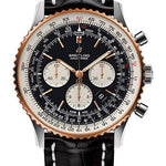 46.00 mm steel and red gold case, 14.51 mm thick, sapphire crystal back, non screw-locked crown with two gaskets, bidirectional bezel with slide rule, cambered sapphire crystal with glareproof treatment on both sides, black dial, Breitling 01 self-winding movement with date in dial aperture and chronograph function, approximately 70 hours of power reserve, black croco strap, tang buckle. Water resistant to 3 bars.