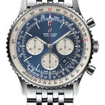 46.00 mm steel case, 14.51 mm thick, sapphire crystal back, non screw-locked crown with two gaskets, bidirectional bezel with slide rule, cambered sapphire crystal with glareproof treatment on both sides, aurora blue dial, Breitling 01 self-winding movement with date in dial aperture and chronograph function, approximately 70 hours of power reserve, steel Navitimer bracelet. Water resistant to 3 bars.