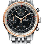41.00 mm steel and red gold case, 14.44 mm thick, non screw-locked crown with two gaskets, bidirectional bezel with slide rule, cambered sapphire crystal with glareproof treatment on both sides, black dial, Breitling 13 self-winding movement with date in dial aperture and chronograph function, approximately 48 hours of power reserve, steel Pilot bracelet. Water resistant to 3 bars.