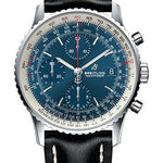41.00 mm steel case, 14.44 mm thick, non screw-locked crown with two gaskets, bidirectional bezel with slide rule, cambered sapphire crystal with glareproof treatment on both sides, aurora blue dial, Breitling 13 self-winding movement with date in dial aperture and chronograph function, approximately 48 hours of power reserve, black leather strap, tang buckle. Water resistant to 3 bars.