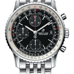 41.00 mm steel case, 14.44 mm thick, non screw-locked crown with two gaskets, bidirectional bezel with slide rule, cambered sapphire crystal with glareproof treatment on both sides, black dial, Breitling 13 self-winding movement with date in dial aperture and chronograph function, approximately 48 hours of power reserve, steel Pilot bracelet. Water resistant to 3 bars.
