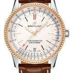 38.00 mm steel and red gold case, 10.10 mm thick, non screw-locked crown with two gaskets, bidirectional slide rule bezel, cambered sapphire crystal with glareproof treatment on both sides, silver dial, Breitling 17 self-winding movement, approximately 38 hrs of power reserve, gold croco strap, folding buckle. Water resistant to 3 bars.