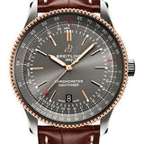 41.0 mm stainless steel and 18K red gold case, 10.0 mm thick, non screw-locked crown with two gaskets, bidirectional slide rule bezel, anthracite dial, Breitling 17 self-winding movement, approximately approx. 38 hrs of power reserve, brown alligator leather strap, folding buckle. Water resistant to 3 bars.