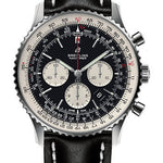 46.00 mm steel case, 14.51 mm thick, transparent sapphire crystal back, non screw-locked crown with two gaskets, rotating bezel with circular slide rule, cambered sapphire crystal with glareproof treatment on both sides, black dial, Breitling 01 (Manufacture) self-winding movement, approximately 70 hrs of power reserve, black leather strap, folding buckle. Water resistant to 3 bars.