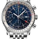 46.00 mm steel case, 15.50 mm thick, non screw-locked crown with two gaskets, bidirectional slide rule bezel, cambered sapphire crystal with glareproof treatment on both sides, blue dial, Breitling 24 self-winding movement, approximately 42 hours of power reserve, steel bracelet. Water resistant to 3 bars.