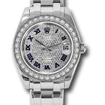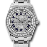 34mm 18K white gold case, screw-down crown, bezel set with 34 diamonds, scratch-resistant sapphire crystal with cyclops lens over the date, damond paved dial, Roman numerals, Rolex calibre 2235 automatic movement, 18K white gold Pearlmaster bracelet with rounded five-piece links, concealed folding Crownclasp buckle. Waterproof to 100 meters.