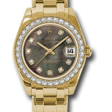 34mm 18K yellow gold case, screw-down crown, bezel set with 34 diamonds, scratch-resistant sapphire crystal with cyclops lens over the date, black mother-of-pearl dial, 10 diamond hour markers, Rolex calibre 2235 automatic movement, 18K yellow gold Pearlmaster bracelet with rounded five-piece links, concealed folding Crownclasp buckle. Water resistant to 100 meters.