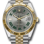 41mm Yellow Rolesor case with 904L steel monobloc middle case, screw-down steel back, 18K yellow gold screw-down crown, 18K yellow gold fluted bezel, scratch-resistant double anti-reflective sapphire crystal with cyclops lens over the date, slate dial, green Roman numerals, Rolex calibre 3235 perpetual self-winding movement with date at 3 o'clock that changes instantaneously at midnight in a few thousandths of a second, approximately 70 hours of power reserve, yellow Rolesor Jubilee bracelet made from a combination of 904L steel and 18K yellow gold with five-piece links, folding Oysterclasp buckle with Easylink 5mm comfort extension link. Waterproof to 100 meters.