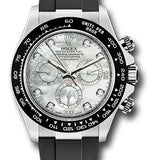 40mm 18K white gold case, screw-down white gold back, screw-down crown and push buttons with Triplock triple waterproofness, black monobloc Cerachrom bezel with engraved tachymetric scale, scratch-resistant double anti-reflective sapphire crystal, white mother-of-pearl dial, 8 diamond hour markers, Rolex calibre 4130 perpetual self-winding movement with chronograph central second hand, 30-minute counter at 3 o'clock, and 12-hour counter at 9 o'clock, approximately 72 hours of power reserve, black Oysterflex strap made from flexible metal blades overmoulded with high-performance elastomer, Oysterlock folding safety buckle with Easylink 5mm rapid extension system. Waterproof to 100 meters.