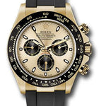 40mm 18K yellow gold case, screw-down yellow gold back, screw-down crown and push buttons with Triplock triple waterproofness, black monobloc Cerachrom bezel with engraved tachymetric scale, scratch-resistant double anti-reflective sapphire crystal, champagne dial with black subdials, index hour markers, Rolex calibre 4130 perpetual self-winding movement with chronograph central second hand, 30-minute counter at 3 o'clock, and 12-hour counter at 9 o'clock, approximately 72 hours of power reserve, black Oysterflex strap made from flexible metal blades overmoulded with high-performance elastomer, Oysterlock folding safety buckle with Easylink 5mm rapid extension system. Waterproof to 100 meters.