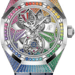 | CASE DETAIL | 18-carat white gold case and bezel set with brilliant-cut multicoloured gemstones, glareproofed sapphire crystal and caseback, crown set with a translucent sapphire cabochon |