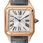 43.5 mm x 31.4 mm pink gold case, 7.3 mm thick, beaded crown set with a cabochon-shaped sapphire, sapphire crystal, satin-brushed silver dial with sunray effect, quartz movement, gray strap, 18K pink gold ardillon buckle. Water resistant to 3 bar (approx. 30 meters/100 feet).