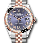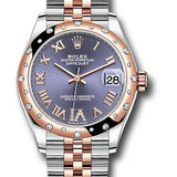 31mm Everose Rolesor case comprised of Oystersteel and 18K Everose gold, screw-down back, screw-down crown with twinlock double waterproofness system, 18K Everose gold domed bezel set with 24 diamonds, scratch-resistant sapphire crystal with cyclops lens over the date, aubergine dial, Roman numerals with diamond set 6, Rolex calibre 2236 perpetual self-winding movement with date at 3 o'clock, approximately 55 hours of power reserve, Everose Rolesor Jubilee bracelet with semi-circular three-piece links, concealed folding Crownclasp buckle. Waterproof to 100 meters. Baselworld 2019 release.