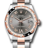 31mm Everose Rolesor case comprised of Oystersteel and 18K Everose gold, screw-down back, screw-down crown with twinlock double waterproofness system, 18K Everose gold domed bezel set with 24 diamonds, scratch-resistant sapphire crystal with cyclops lens over the date, dark rhodium dial, Roman numerals with diamond set 6, Rolex calibre 2236 perpetual self-winding movement with date at 3 o'clock, approximately 55 hours of power reserve, Eversose Rolesor Oyster bracelet made from a combination of steel and 18K everose gold with flat three-piece links, folding Oysterclasp buckle with Easylink 5mm comfort extension link. Waterproof to 100 meters. Baselworld 2019 release.