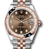 31mm Everose Rolesor case comprised of Oystersteel and 18K Everose gold, screw-down back, screw-down crown with twinlock double waterproofness system, 18K Everose gold domed bezel set with 24 diamonds, scratch-resistant sapphire crystal with cyclops lens over the date, chocolate dial, diamond hour markers, Rolex calibre 2236 perpetual self-winding movement with date at 3 o'clock, approximately 55 hours of power reserve, Everose Rolesor Jubilee bracelet with semi-circular three-piece links, concealed folding Crownclasp buckle. Waterproof to 100 meters. Baselworld 2019 release.