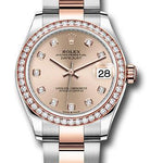 31mm Everose Rolesor case comprised of Oystersteel and 18K Everose gold, screw-down back, screw-down crown with twinlock double waterproofness system, 18K Everose gold bezel set with 46 diamonds, scratch-resistant sapphire crystal with cyclops lens over the date, rose dial, diamond hour markers, Rolex calibre 2236 perpetual self-winding movement with date at 3 o'clock, approximately 55 hours of power reserve, Eversose Rolesor Oyster bracelet made from a combination of steel and 18K everose gold with flat three-piece links, folding Oysterclasp buckle with Easylink 5mm comfort extension link. Waterproof to 100 meters. Baselworld 2019 release.