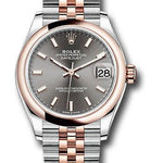 31mm Everose Rolesor case comprised of Oystersteel and 18K Everose gold, screw-down back, screw-down crown with twinlock double waterproofness system, 18K Everose gold domed bezel, scratch-resistant sapphire crystal with cyclops lens over the date, dark rhodium dial, index hour markers, Rolex calibre 2236 perpetual self-winding movement with date at 3 o'clock, approximately 55 hours of power reserve, Everose Rolesor Jubilee bracelet with semi-circular three-piece links, concealed folding Crownclasp buckle. Waterproof to 100 meters. Baselworld 2019 release.